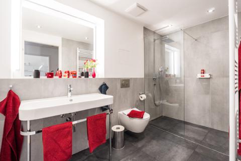 ▪ Bad mit bodengleicher Dusche, Waschtisch, Fön